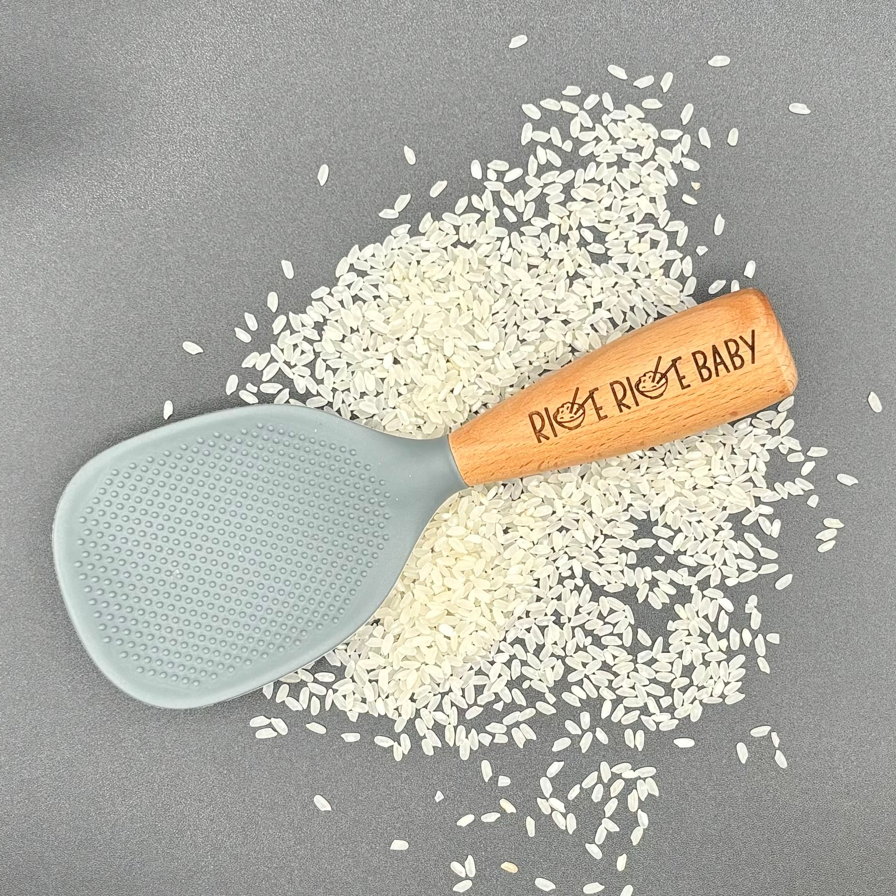 Silicone with wood handle rice paddle etched with “Rice Rice Baby.” Approximate dimensions: 8.25” L x 3.00” W. Comes in 3 colors.